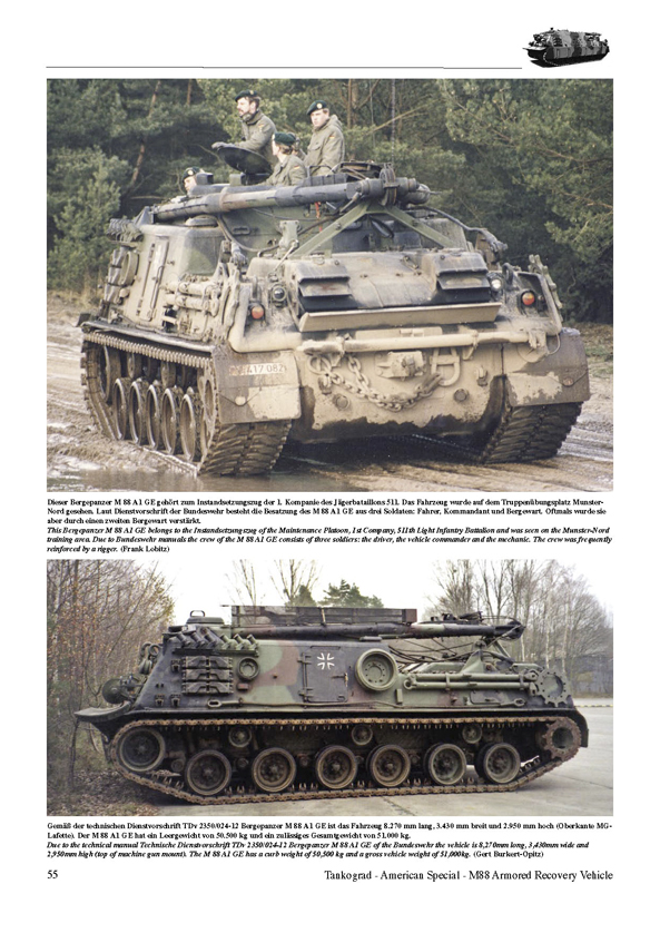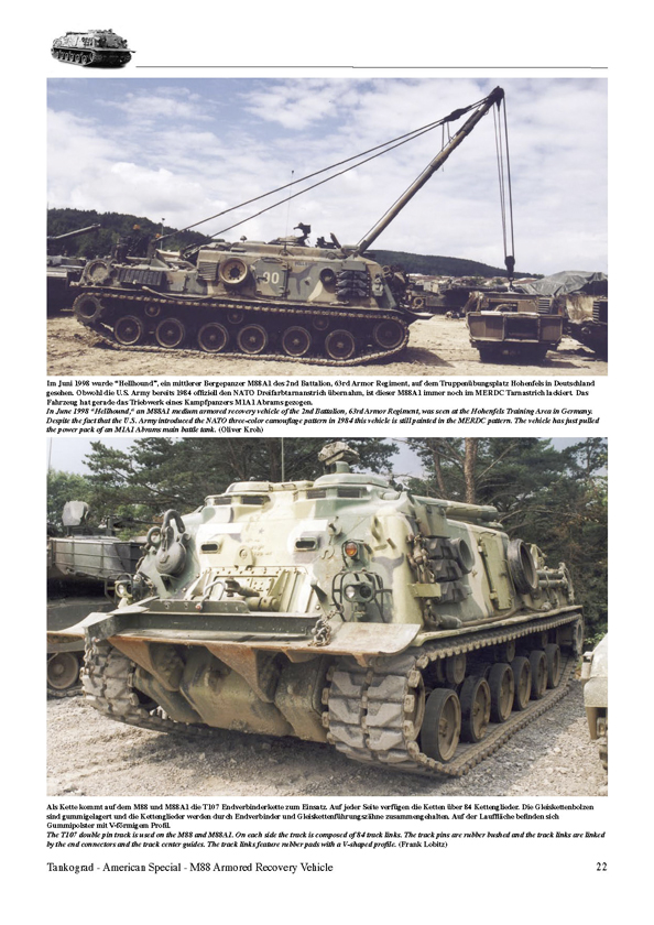 Der mittlere Bergepanzer M88 bildet seit seiner Einführung 1960 immer noch das Rückgrat schwerer Bergeoperationen der U.S. Army und des U.S. Marine Corps. Trotz zahlreicher Versuche ihn zu ersetzen, ist er immer noch im aktiven Dienst, und wurde über die Variante M88A1 bis hin zum heutigen schweren Bergepanzer M88A2 HERCULES, der auch unter Operation Iraqi Freedom zum Einsatz kommt, kontinuierlich kampfwertgesteigert. Neben zahlreichen bisher unveröffentlichten Fotos der U.S. Varianten, darunter auch Rundgänge um Einsatzfahrzeuge, widmen sich Sonderkapitel dieser Publikation dem M 88, M 88 A1 GE und M 88 A1 GE A1 der Bundeswehr und den M88 anderer Nationen.